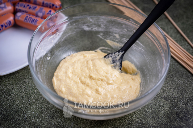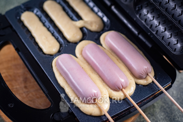 Освободите все сосиски от оболочек. Тестом заполните кондитерский мешок. В мультипекаре установите панели для приготовления корн-догов. Разогрейте мультипекарь. В формочки отсадите тесто из кондитерского мешка, поверх выложите сосиски, в которые предварительно воткнули деревянные шпажки.