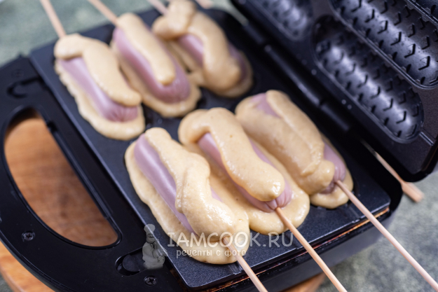 Поверх сосисок отсадите еще порцию теста. Выпекайте корн-доги в мультипекаре 3-4 минуты (или в соответствии с инструкцией к мультипекарю).