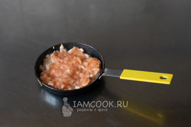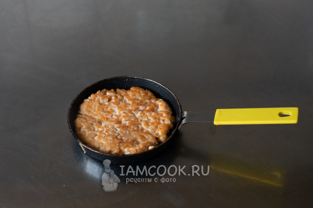 Выложим рыбный фарш на горячую сковороду, разровняем и обжарим около двух минут (пока мясо не побелеет до верхнего слоя хотя бы по краям).