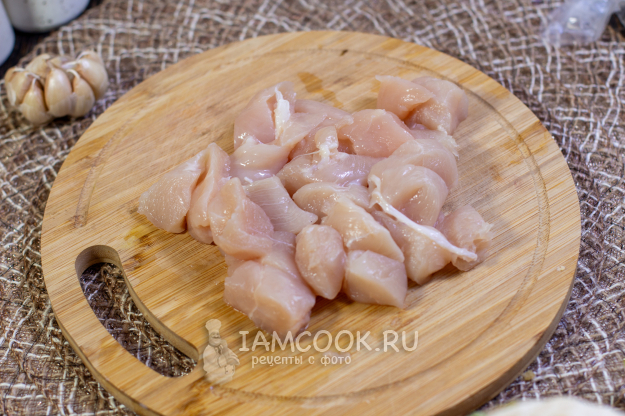 Куриные филе помойте, обсушите и нарежьте небольшими кусочками.