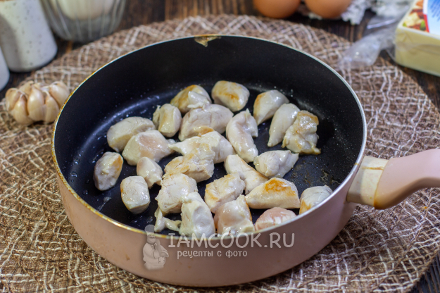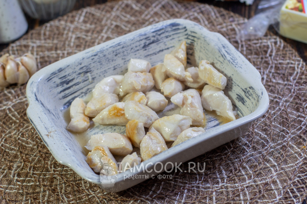В подходящую форму для выпечки выложите одним слоем обжаренную курицу.