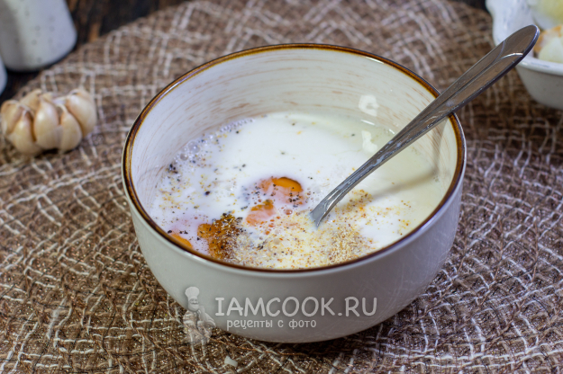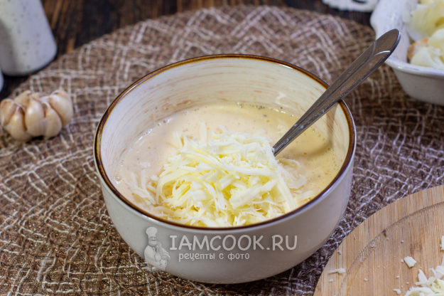 Добавьте половину натертого сыра в заливку. Перемешайте.