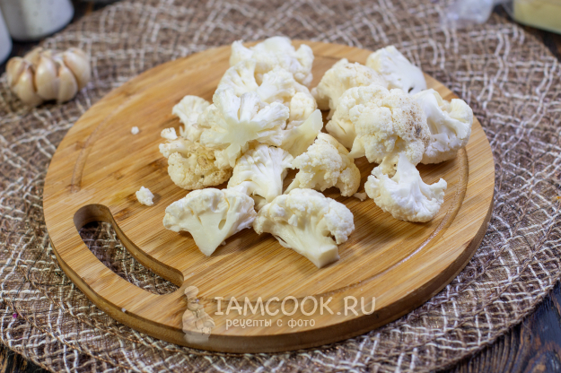 Свежую цветную капусту промойте, срежьте верхние листья. Ножом срежьте все соцветия. Их нужно разобрать или порезать на некрупные кусочки.