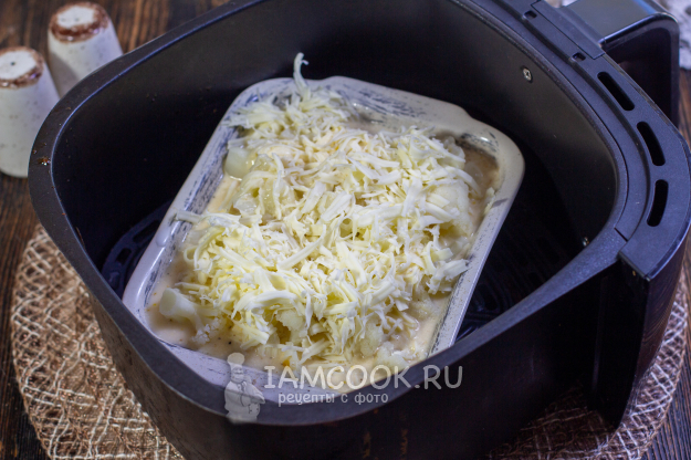 Приготовленную заливку вылейте на курицу с капустой, а сверху засыпьте оставшимся сыром. Установите форму в чашу аэрогриля и запекайте цветную капусту с курицей при 170 градусах 15-20 минут.