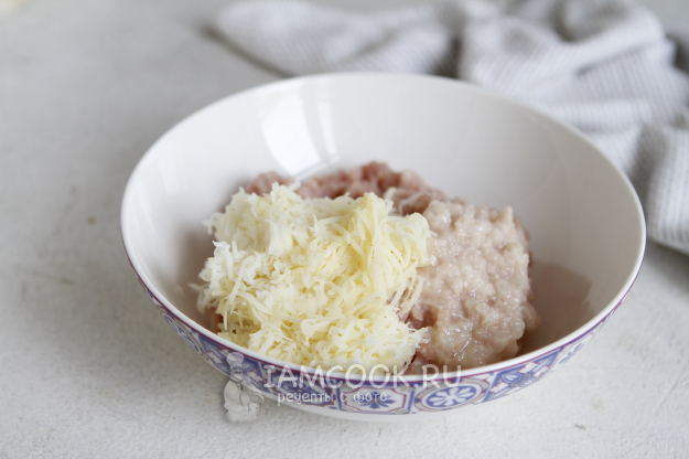 Сыр моцарелла или любой твердый сыр натрите на терке. Добавьте в фарш сыр и специи по вкусу.