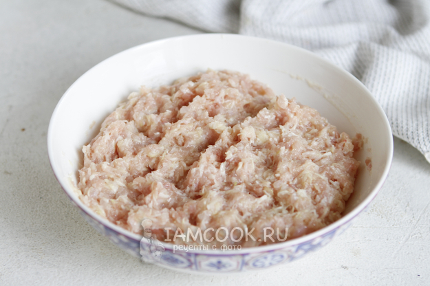 Тщательно вымесите фарш. Чашу затяните пищевой пленкой и уберите в холодильник на 30-40 минут.