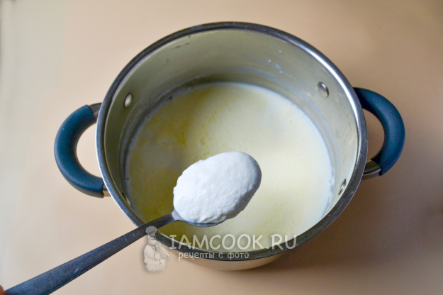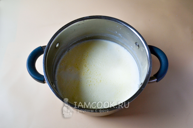 Если у вас тоже деревенское молоко из-под коровы, то налейте его в кастрюлю и прокипятите. Пенку, образующуюся на поверхности, можете снять, а можете оставить. Кипяченое молоко охладите до теплого состояния, примерно 35°C.