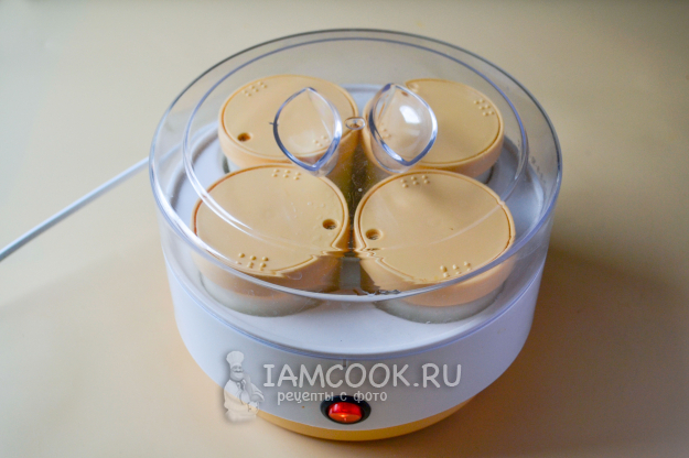 Закройте стаканчики крышками, поставьте в йогуртницу. Закройте ее крышкой и включите в сеть.