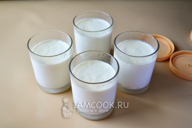 Примерно через 8 часов, проведённых в йогуртнице, йогурт без специальной закваски готов. Если йогурт будет недостаточно густым, оставьте йогуртницу включенной еще на 1-2 часа.