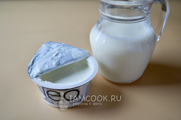 Положите в теплое молоко натуральный йогурт, 1-2 ст.л. Тщательно перемешайте молоко с йогуртом.