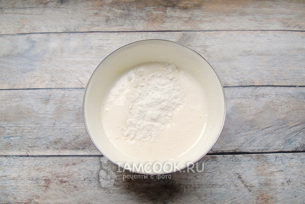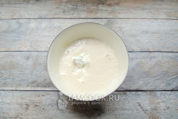 Взбейте яйца с сахаром в пышную, белую пену. Добавьте сметану и перемешайте.