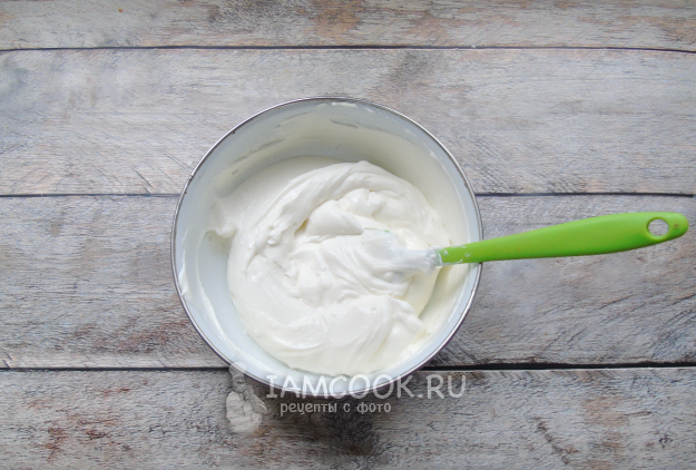 Приготовьте крем для торта. В миску выложите сметану, сахарную пудру и загуститель. Если у вас сметана жирностью 25-35%, загуститель не нужен.