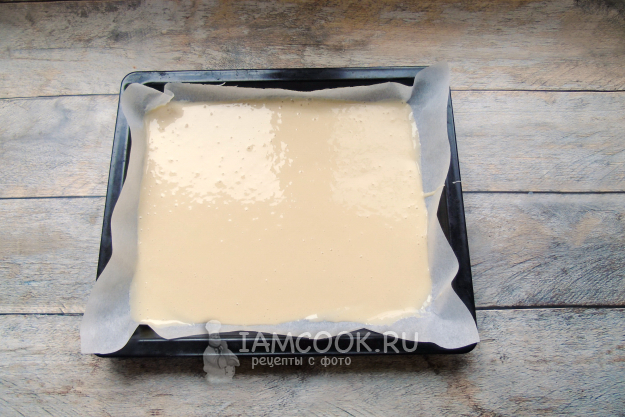 Торт может быть круглым, квадратным или прямоугольным. Я взяла прямоугольную форму размером 25х30 сантиметров. Постелите в неё пергамент и налейте тесто. Круглую форму берите диаметром 22 сантиметра.