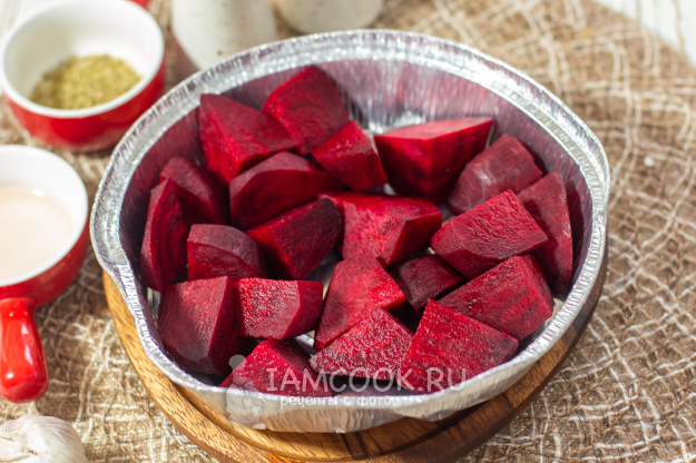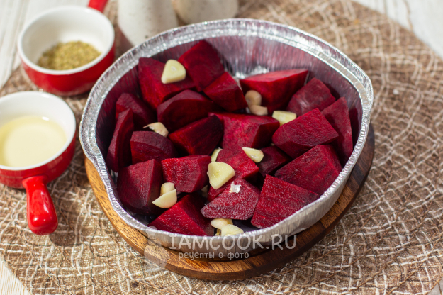 Посыпьте сушеным орегано, солью и черным молотым перцем. Полейте маслом. Установите форму со свеклой в чашу аэрогриля и запекайте 20-30 минут при температуре 180 градусов. Время приготовления кусочков свеклы в аэрогриле будет зависеть от размера нарезки.