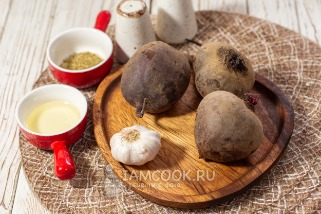 Соберите необходимые продукты для запекания свеклы кусочками в аэрогриле. Возьмите сырую свеклу, немного растительного масла, сушеных специй и свежего чеснока.