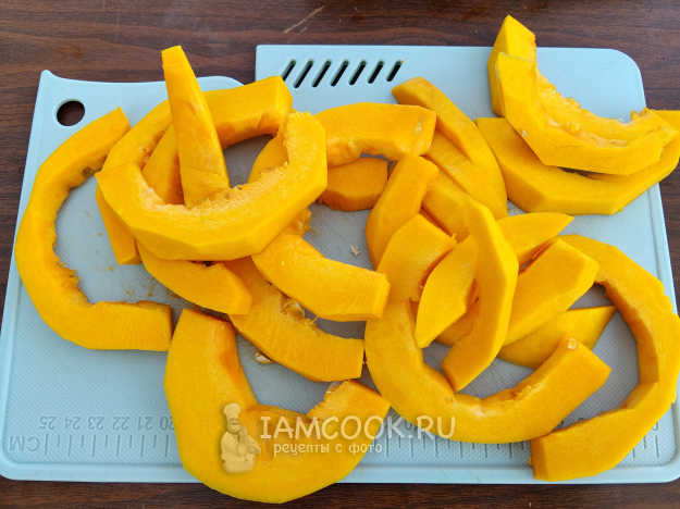 Тыкву почистить и нарезать крупными слайсами.