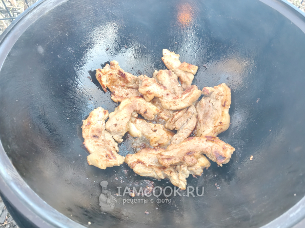 Так как мясо у меня с жирком, я его хорошенько прижарила со всех сторон.