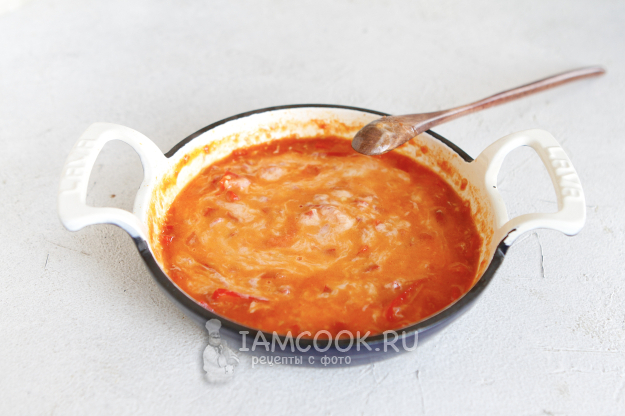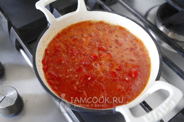 Помидоры разрежьте пополам и на мелкой терке натрите мякоть. Добавьте в сковороду.