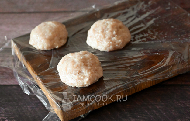 Мокрыми руками сформируйте из фарша плотные колобки и выложите их на плёнку.