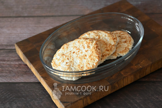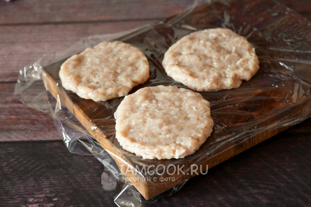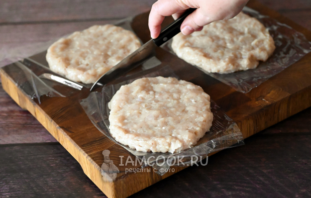 Затем, также мокрыми руками, придайте куриным бифштексам плоскую форму. Толщина должна быть около 1,5 сантиметров. Имейте в виду, что при обжаривании бифштексы немного сожмутся.