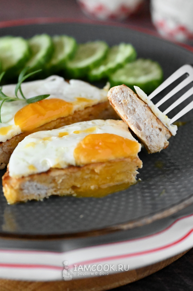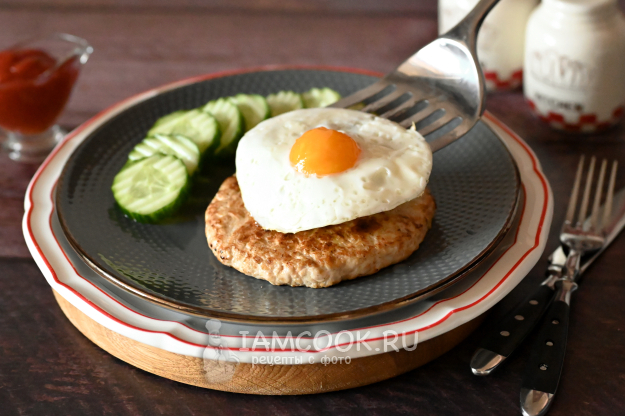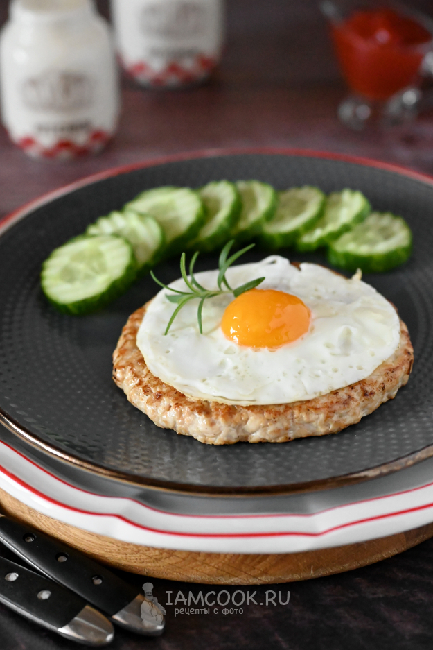 Всё готово! Можно подавать бифштекс из курицы к столу. Положите его на тарелку, а сверху аккуратно поместите поджаренное яйцо.