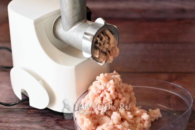 Куриное филе и лук нарежьте произвольными кусками, которые поместятся в жерло вашей мясорубки. Пропустите филе и лук через мясорубку с самой крупной решеткой.