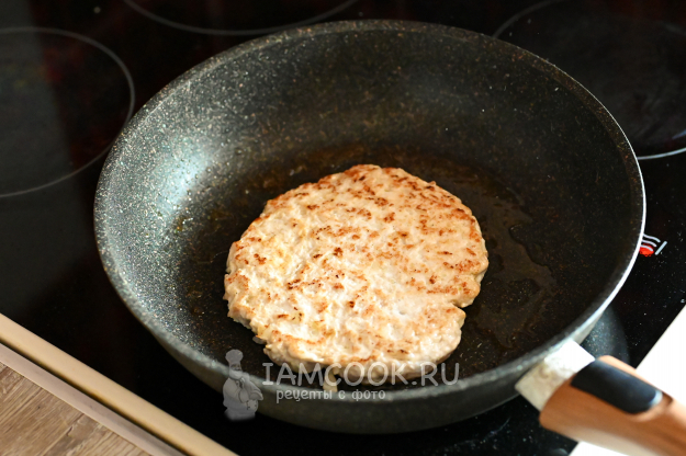 Обжаривайте бифштекс из куриного фарша на сильном огне до румяной корочки с двух сторон, буквально по паре минут с каждой стороны (сковородку слегка потряхивайте). Крышкой сковородку не накрывать!