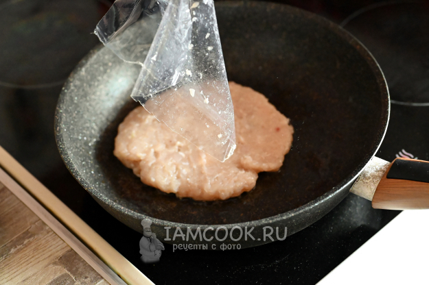 Сковороду разогрейте на сильном огне с небольшим количеством масла. Перенесите на ладони куриный бифштекс, лежащий на плёнке, и переверните его аккуратно на сковороду (плёнкой вверх). Плёнку немедленно снимите, чтобы её края не прижарились к сковородке!