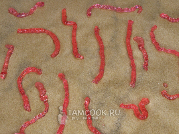 Охлаждённые трубочки по очереди опускаем на несколько секунд в тёплую воду, затем выдавливаем «червячков» на пергаментную бумагу. Убираем обратно в холодильник минимум на 15 минут.