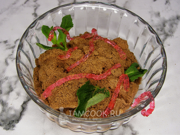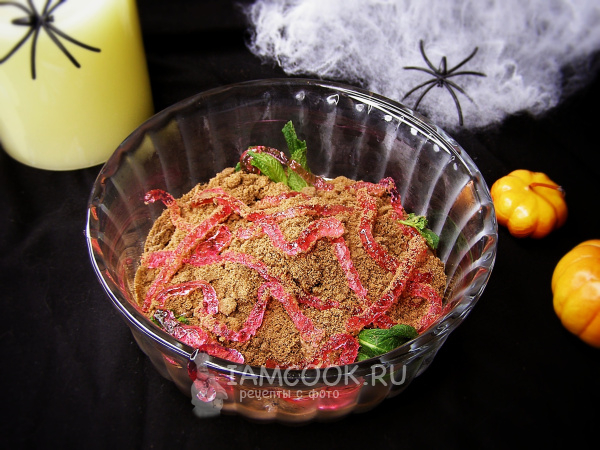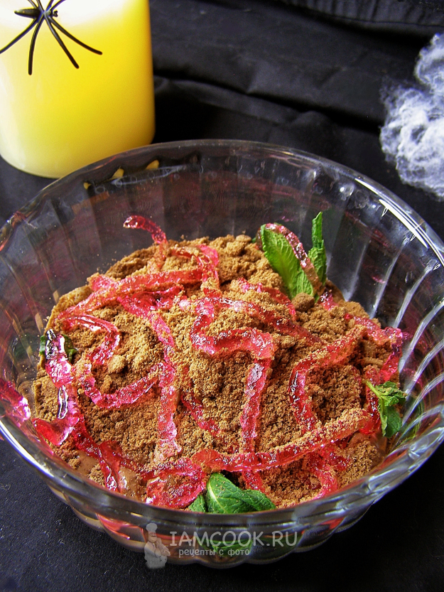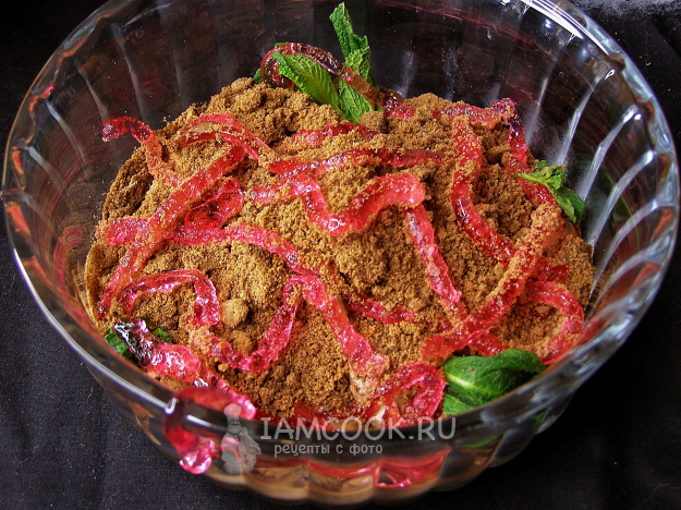 Сверху на крошки печенья выкладываем «червячков». Можно слегка обвалять их в печенье или немного присыпать крошками.