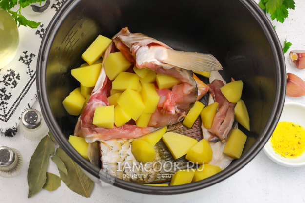 Выложите части рыбы в чашу мультиварки. Нарежьте картофель крупными кубиками и добавьте туда же.