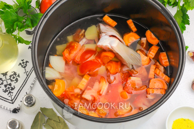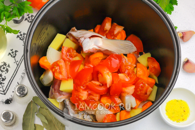 Нарежьте крупным кубиком помидор или несколько томатов, всыпьте нарезку в емкость. Мультиварка хороша тем, что в нее можно загрузить сразу все продукты без очередности и приготовить.
