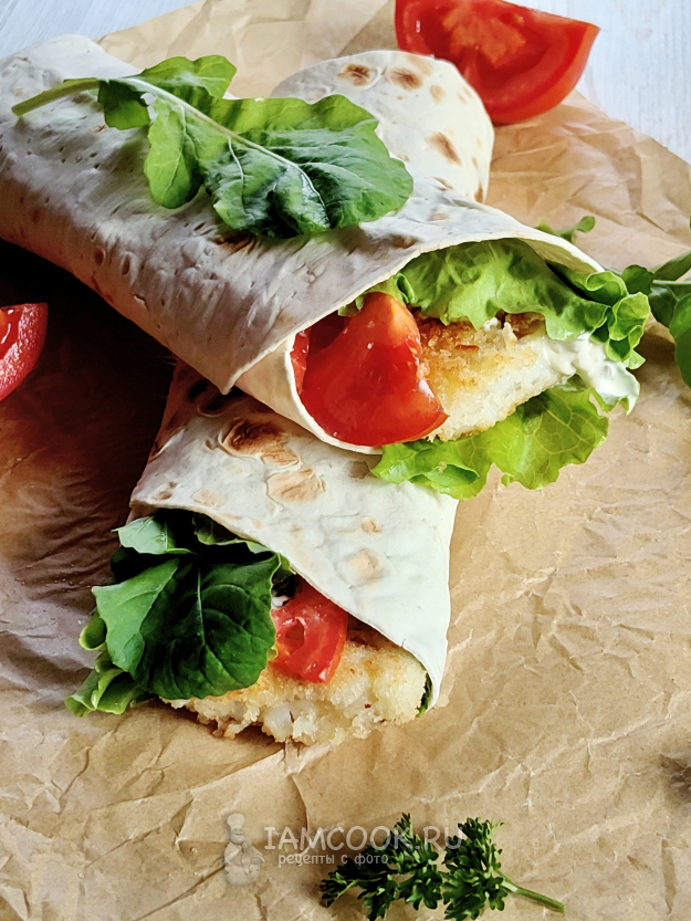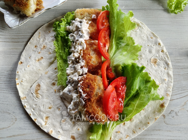 На лаваш выложить несколько листьев салата, рыбу, соус и дольки помидора.
