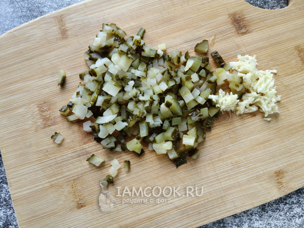 Для соуса нарезать огурец, измельчить чеснок. Перемешать с майонезом и сметаной.