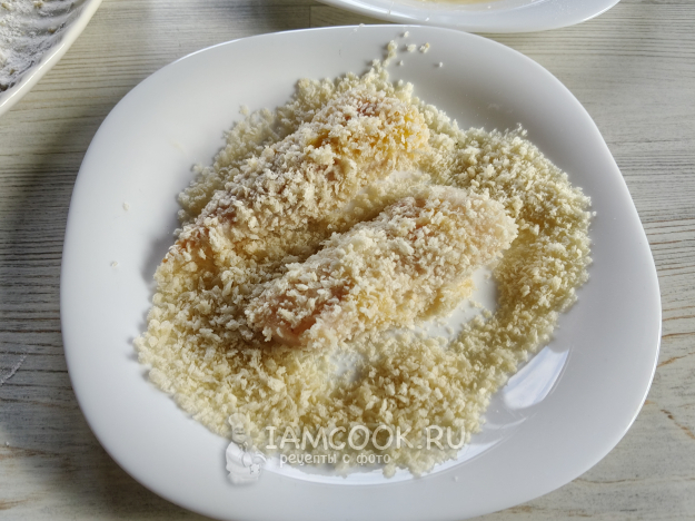 Затем обмакнуть рыбу во взбитое яйцо и запанировать в сухарях.