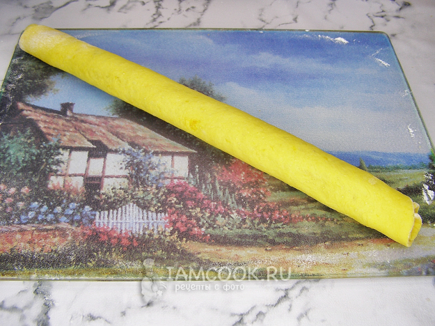 Тесто делим на три равные части и каждую часть тонко раскатываем прямоугольником размером примерно 25 на 35 сантиметров.