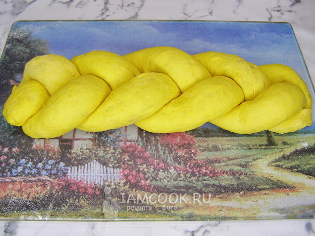 Перекладываем плетёнку на противень, застеленный пергаментной бумагой, и оставляем минут на 20 для расстойки, прикрыв полотенцем. По желанию перед выпечкой можно смазать верх и бока взбитым яйцом.