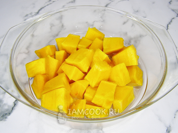 Тыкву очищаем от семян и кожицы, нарезаем небольшими кусочками. Перекладываем в подходящую ёмкость, наливаем примерно 100 мл воды и накрываем крышкой. Ставим в микроволновку и запекаем при мощности 800 Вт 10-15 минут, до мягкости. Если используете духовку, то запекайте тыкву 20-30 минут при температуре 180 градусов.