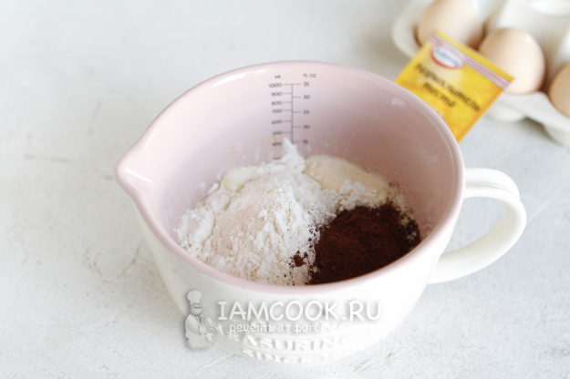 Введите муку, какао-порошок и разрыхлитель для теста.