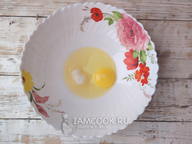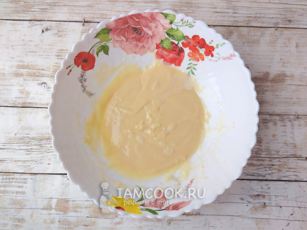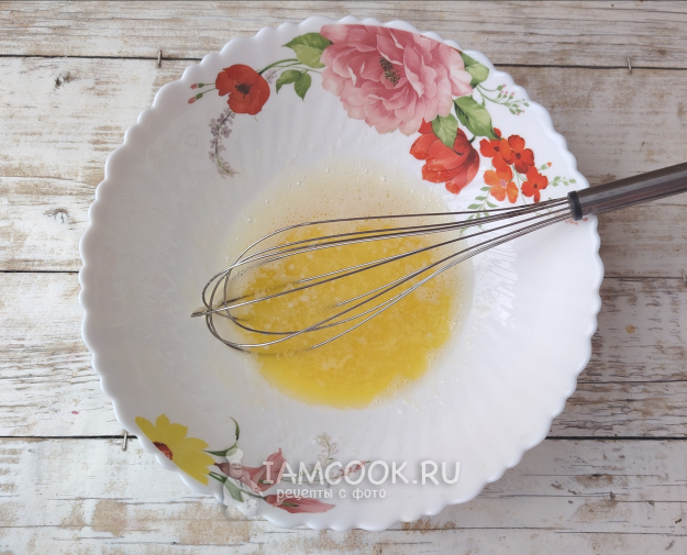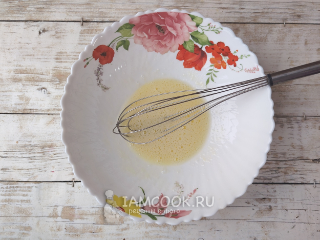 Влить масляную в яичную смесь, перемешать содержимое посуды.