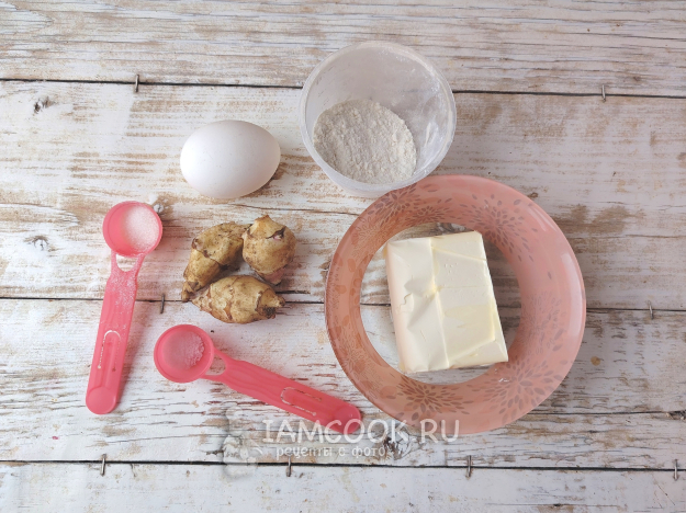 Собрать по списку продукты для шарлотки с топинамбуром. Хранящиеся в холодильнике продукты желательно вынуть из него заранее, чтобы они были комнатной температуры.