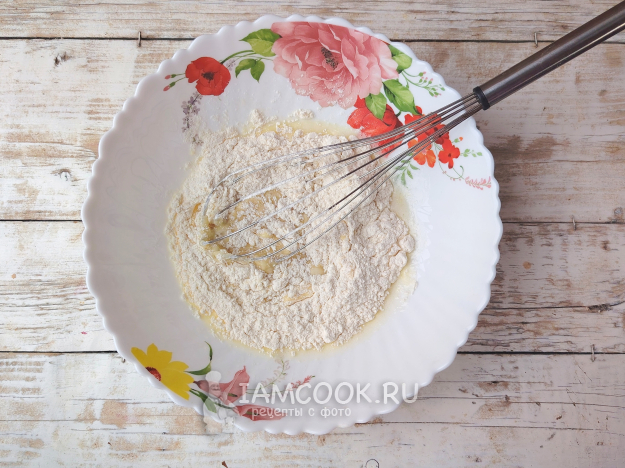 Всыпать просеянную муку и разрыхлитель в жидкость.