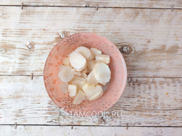 Топинамбур помыть, почистить, нарезать овощ на дольки.