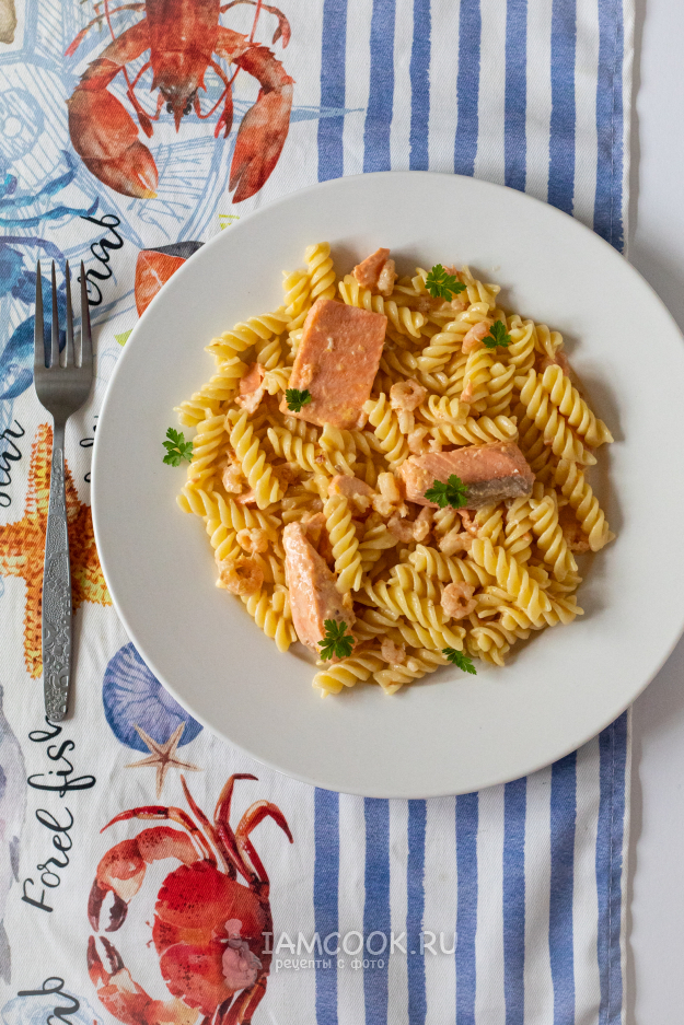 Пасту с лососем и креветками можно декорировать петрушкой.
