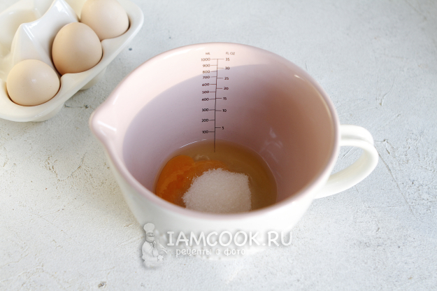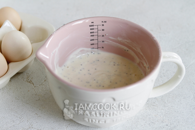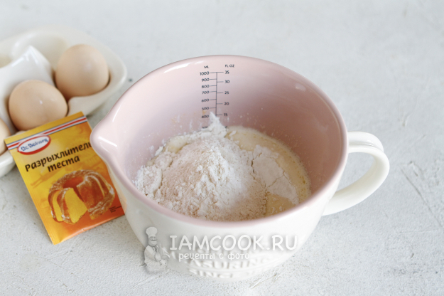 Просейте пшеничную муку, добавьте разрыхлитель. Венчиком тщательно все перемешайте. Консистенция должна быть однородной, без комочков. Если тесто будете замешивать на молоке, то муки потребуется чуть больше (примерно на 1-1.5 ст. л. ложки).