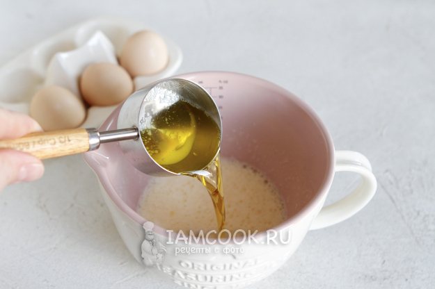 Растопите сливочное масло и добавьте его вместе с кефиром в чашу. Вместо кефира можно взять йогурт без добавок, сметану или молоко.