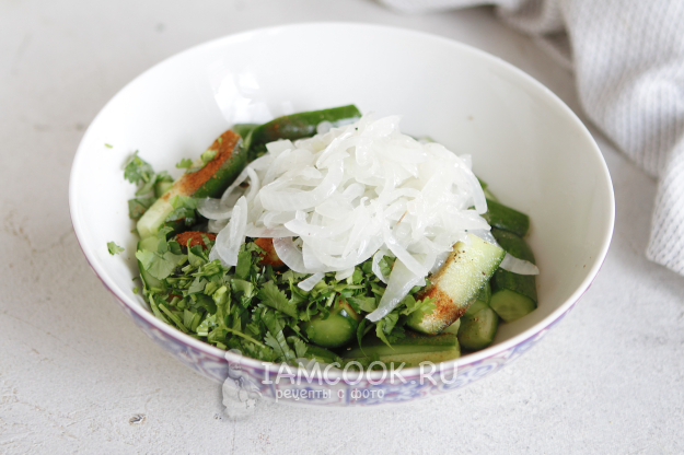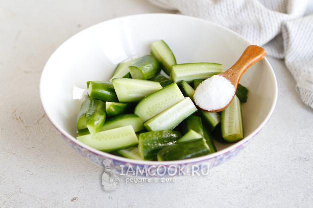 Переложите огурцы в глубокую чашу и посолите. Хорошо перемешайте огурцы, чтобы соль равномерно распределилась. Оставьте огурцы в чаше на 10-15 минут и займитесь луком.
