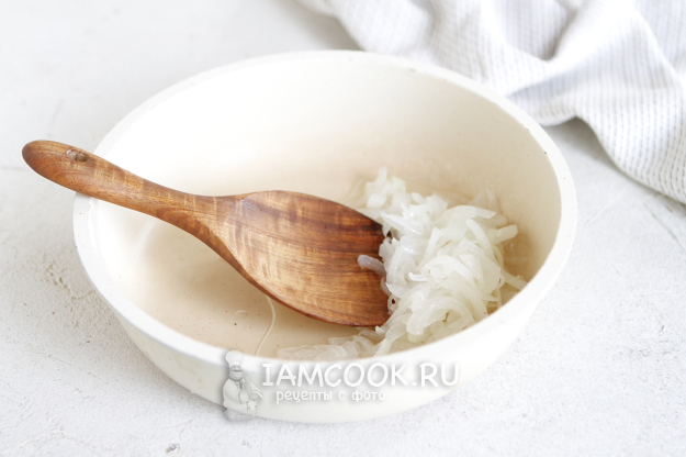 Почистите одну крупную луковицу и нарежьте ее полукольцами. На небольшом огне обжарьте лук на растительном масле до мягкости.