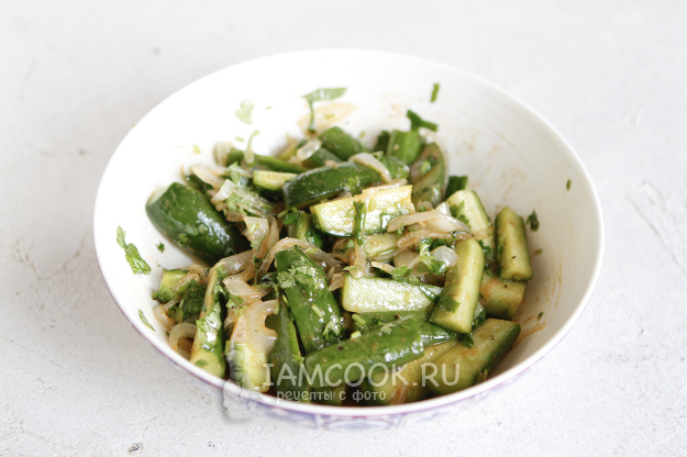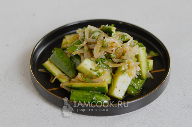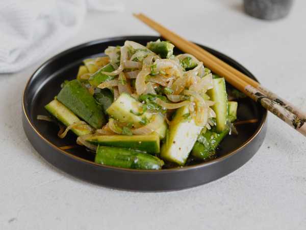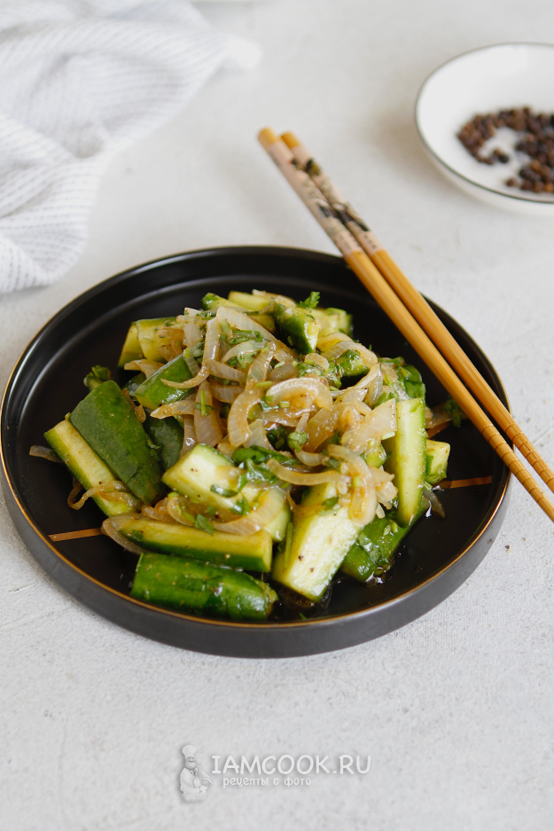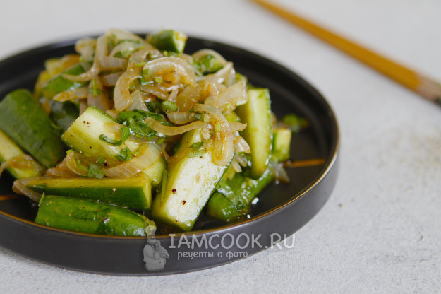 Это корейское овощное блюдо одновременно может быть как теплым салатом, так и просто закуской. Рецепт его очень простой и готовится оно на раз-два. Больших секретов у него нет, но есть одна особенность. Огурцы заправляются жареным луком и лука должно быть много. По возможности заправляйте блюдо рисовым уксусом, а количество специй добавляйте по своему вкусу.