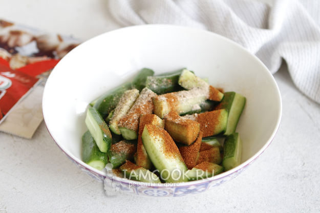 10 минут будет вполне достаточно, чтобы огурцы выделили сок. Слейте его и добавьте в чашу подготовленные специи.